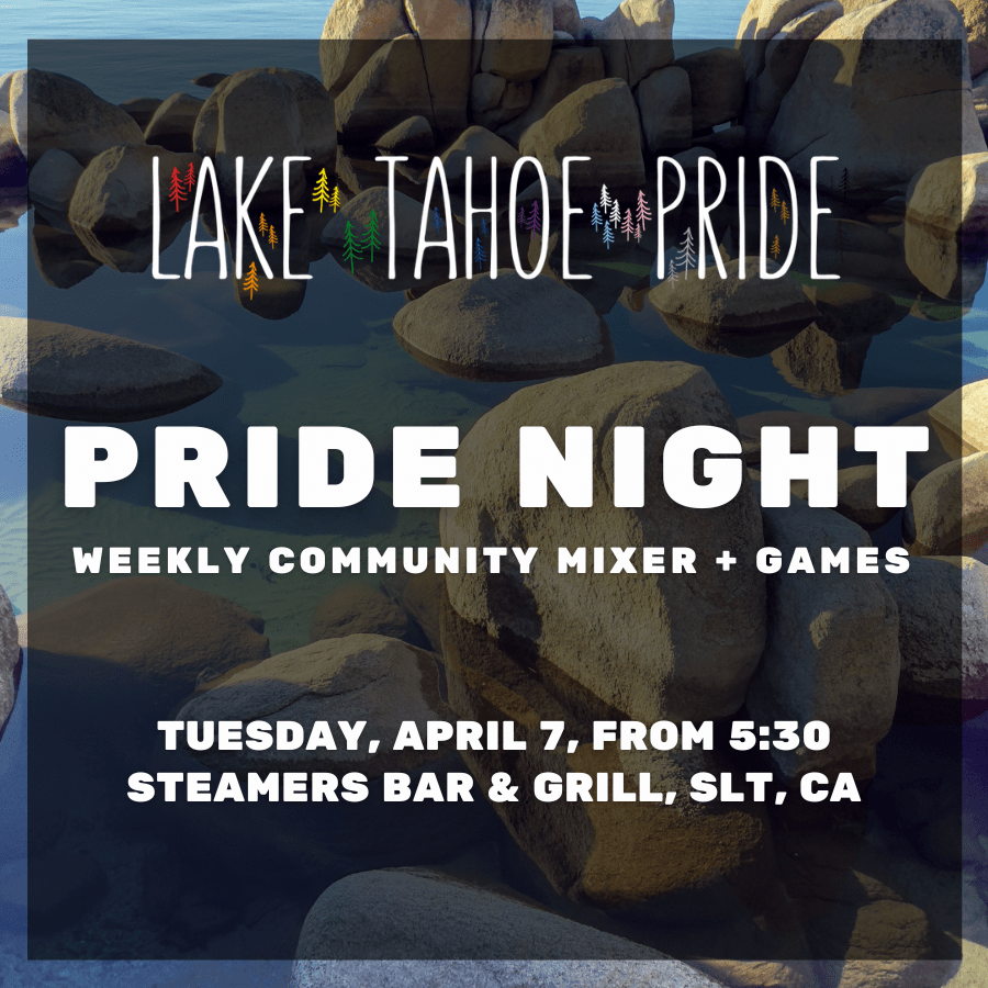Every Tuesday, Lake Tahoe Pride hosts a social mixer at a restaurant, brewery, bar, beach, or other welcoming venue around South Lake Tahoe. Our diverse weekly mixers are a way for LGBTQIA+ people above 6,000 feet to make connections, build community, and find an extra bright spot in the week.